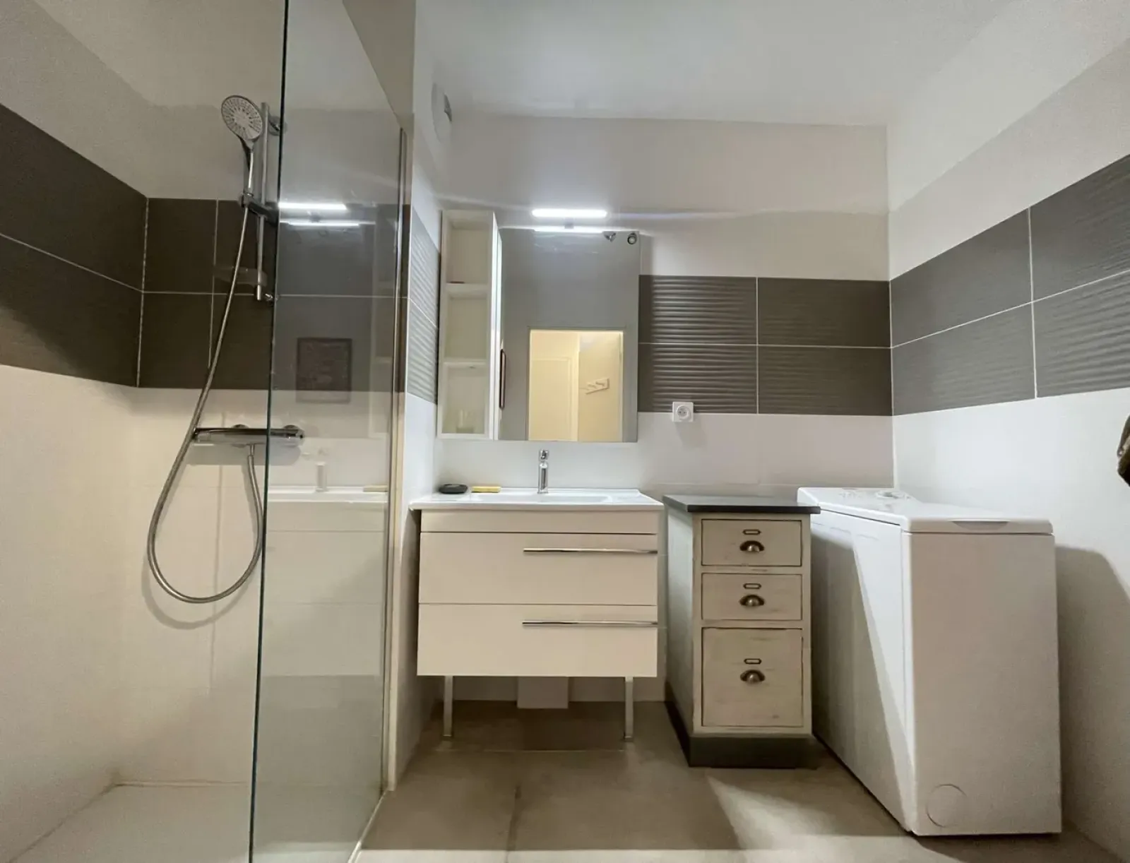 La salle d’eau moderne propose une douche à l’italienne, un meuble vasque avec rangements et un sèche-serviettes, offrant un confort optimal au quotidien. La chambre spacieuse bénéficie d’un placard intégré.