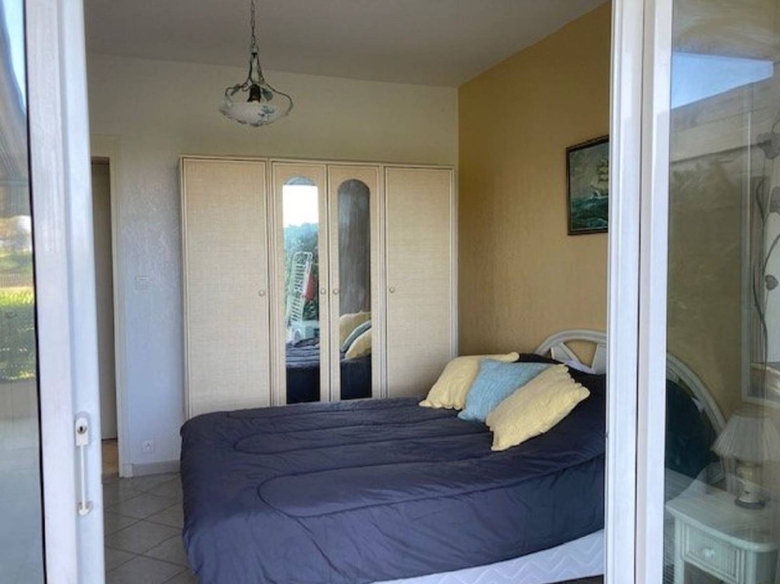 La chambre est également dotée d'une baie vitrée coulissante et d'un volet roulant électrique. Elle est aménagée avec un lit en 140 cm et une armoire spacieuse, offrant un espace de rangement pratique.