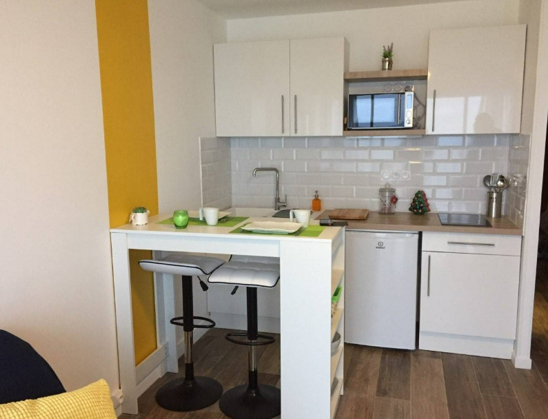 Il comprend également une cuisine ouverte est parfaitement agencée avec un évier, des rangements, une plaque de cuisson à 2 feux, un réfrigérateur top, un four multifonctions (grill + micro-ondes) et un bar avec 2 tabourets. Ainsi qu'une salle d'eau dotée d'une douche, d'un WC, d'un meuble de rangement, d'un miroir, d'un placard-penderie et d'un lave-linge.