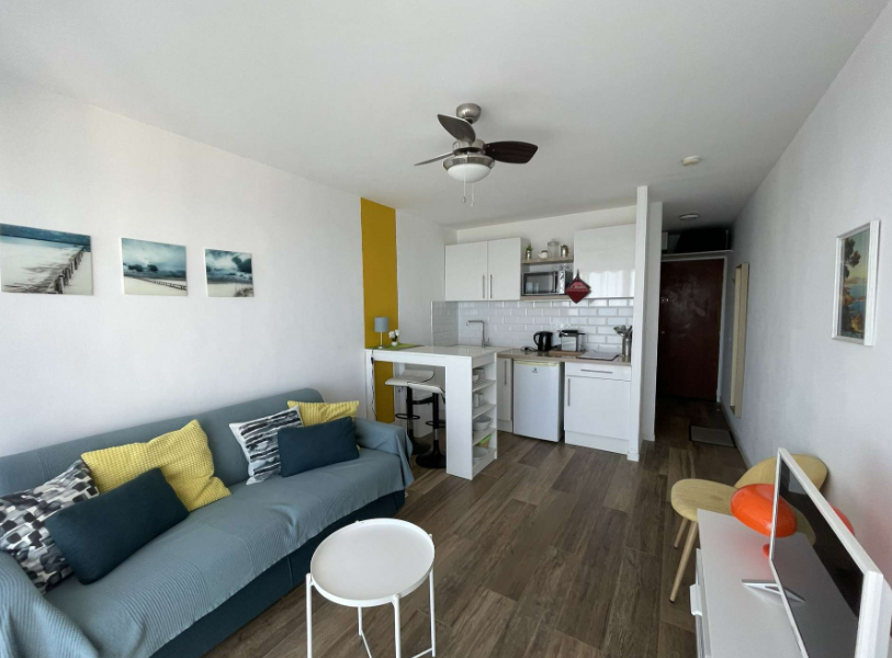 Ce studio dispose d'un salon-séjour lumineux grâce à sa baie vitrée coulissante qui offre une vue imprenable sur la mer. Il comprend également une table pliante pour 4 personnes, un canapé RAPIDO (140 cm), un meuble TV et une télévision. Pour votre confort, vous trouverez un ventilateur au plafond, un lampadaire, des rideaux et des jeux de société pour les enfants.