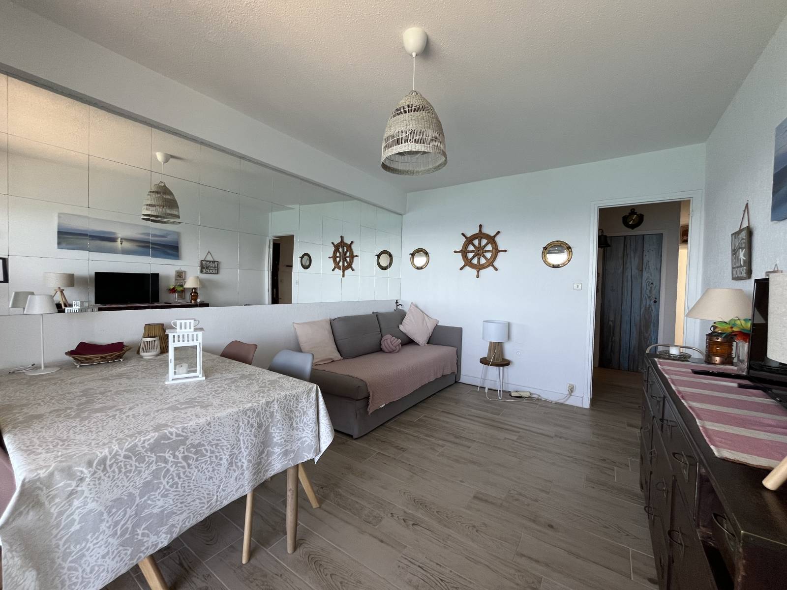 L’appartement est situé au 10ème étage d’une résidence avec ascenseur, offrant ainsi une vue imprenable. En entrant, vous découvrirez un séjour accueillant, équipé d’un couchage confortable pour deux personnes grâce à un lit gigogne. Ce coin de vie comprend également une table et des chaises, un meuble pour la vaisselle, une TV et un accès Wi-Fi.