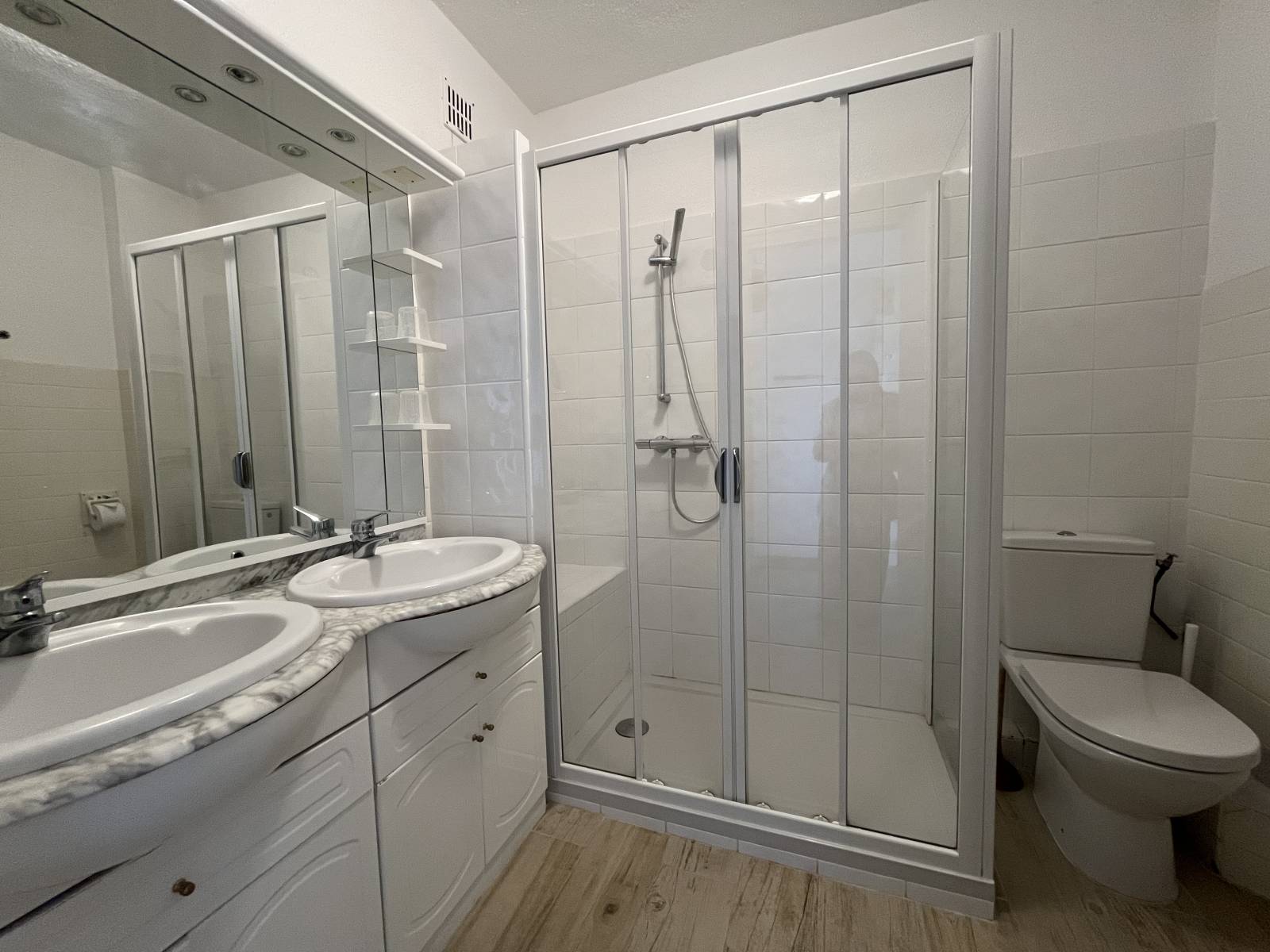 La salle de douche est moderne et fonctionnelle. Elle comprend une douche à l'italienne, une double vasque avec meuble et un lave-linge. Les WC sont intégrés à cette salle de douche pour un maximum de confort.